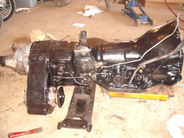 I got the Transmission all cleaned up, wire-wheeled and painted today.  Bolted it up to the T-case.  Now, I just need to get a pan gasket, filter and fluid, plus a couple of trans lines...