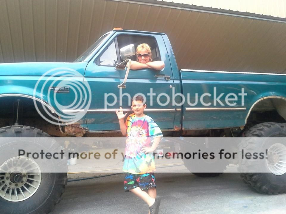 Nope, sorry man that the wife and kid.  He wanted to drive it.  I kinda built this for them.  Before them I had a few mud toys.  Toyota with 383 on 35 boggers, Ranger 408 on 36 TSL, 79' f350 with BB on 38's so I figured they needed to enjoy a good time.  With a stock powertrain it should stay together for the rest of year.  Went through front end with all new joints ( ball and U), bearings seals.  No blocks in the back used 6" spring, shackle flip and made new front drop brackets.  Front is 4" springs with shackle reversal and front drop brackets.  I havent finished the brackets yet but hope to tonight.  They are all welded out jsut need to trim them so they dont look so bad.  They dont sit much below bumper but you can see them.  The cross tie is 2x4x1/4 and will have a receiver mount on it for recovery.