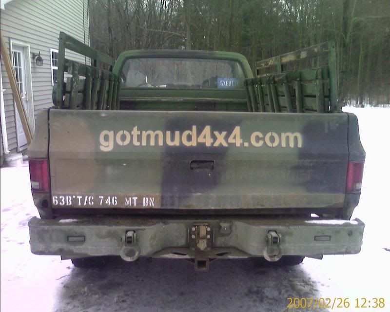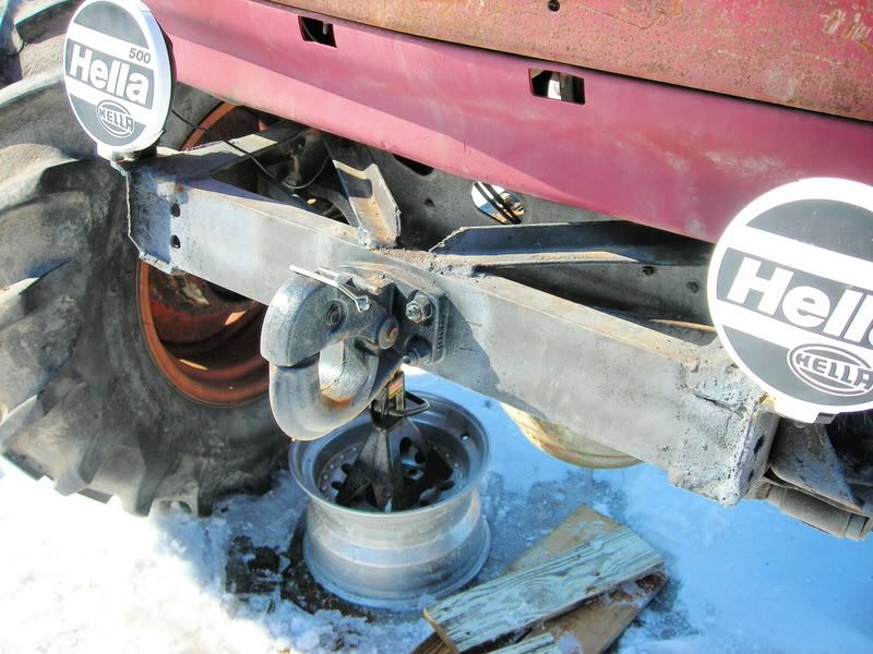 older pic. the rear is 1 or 1 1/8 thick  cant remmber off hand but that is welded and bolt with grade 8 bolts and what you cant see that have 3/8 angle iron tied farther back into the frame.  that is all attached to boxed 3/8 thick  square tubing. its all welded up tight. and the d-rings welded real tight. a guy and 44s was yanking one of them and another guy on 40s was yanking on the center at the sametime!! with no troubles :)