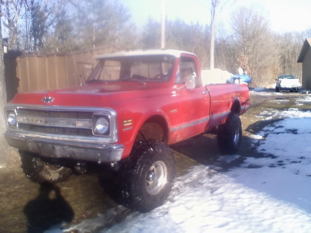 had to try out 4wd haha.   need to get and mount vacuum line for tranny.  got 3 different power steering belts that are too big or too small. getting the right one soon. need to bend and put on power steering line(s).  waiting to find a decent step rear bumper. got rear hitch on. passenger seat ripped out. drivers side next. front driveshaft on. umm not too much left to do on her but keep it away from salt.