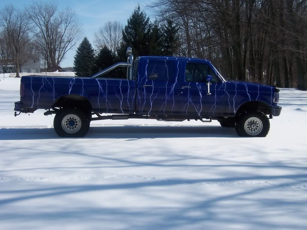 I desided to build another truck. This time its a 96 F-350 crew cab. Cutting edge in ovid is working on the body wrap right now its going to be similar to blue thunder but alot more extream ill get pics up as oon as i can. Its got a 460 4:11 gears. the wrap is a couple grand so i dont think it will get a lift right away but we will see