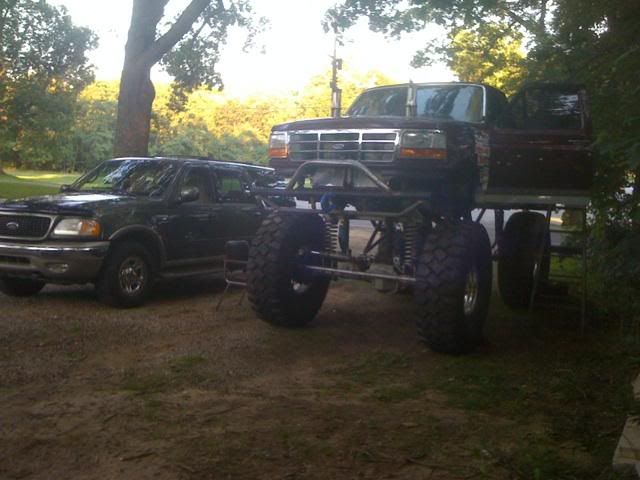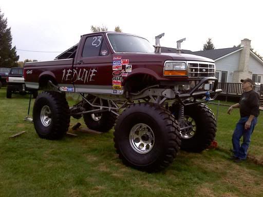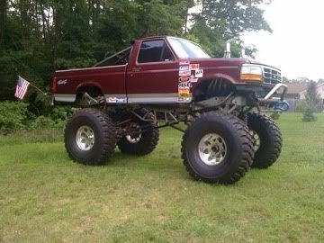 1996 ford f150 , with 53" goodyear tires, 20" chrome mickey thompson rims, dana 60 one ton axles with 5:13 gears and detroit lockers, rear has a welded pinion. Truck has a rebuilt 1973 460 with all kinds of goodies. upright (zoomie) headers,summit racing ignition system, lunati voodoo racing cam, rear mounted radiator with dual fans, rear mounted fuel cell as well as the battery, and transmission cooler with its own cooling fan. truck has raceway coilovers in the rear and custom front coil suspension, truck is all 4 linked, Has 4 point race harnesses with a full roll cage in the cab and roll bar welded to the frame in the bed. truck is setup for hydraulic steering just need to hook every thing up