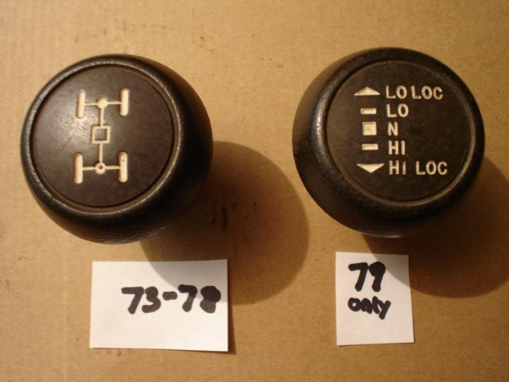 203 shift knobs: Again 2 designs 73-78 with engraved 4x4 frame..........79 had range pattern engraved on the knob (this did away with the earlier 73-78 style metal range plate at the base of the lever. (79 Np205s switched over to this as well). The 1979 style knob WILL NOT fit 73-78 levers.........the threading....and hole diameter is smaller.