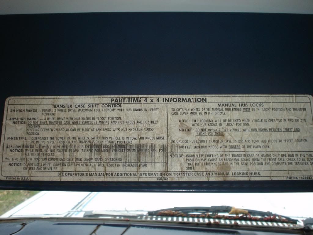 1981-87 Transfer case Control Sticker on sunvisor for Np208 in my 86 K20. This sticker was used on all 81-87 gm 4x4s (except K30 models) and also 1988 model suburbans. It would have been used on 89-91 K5 blazers and suburbans as well, even though they had switched to the Np241 for both of these in 89.