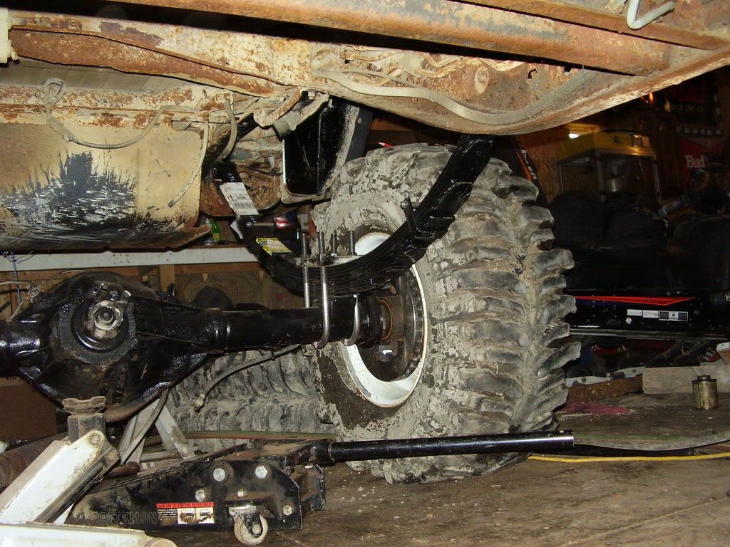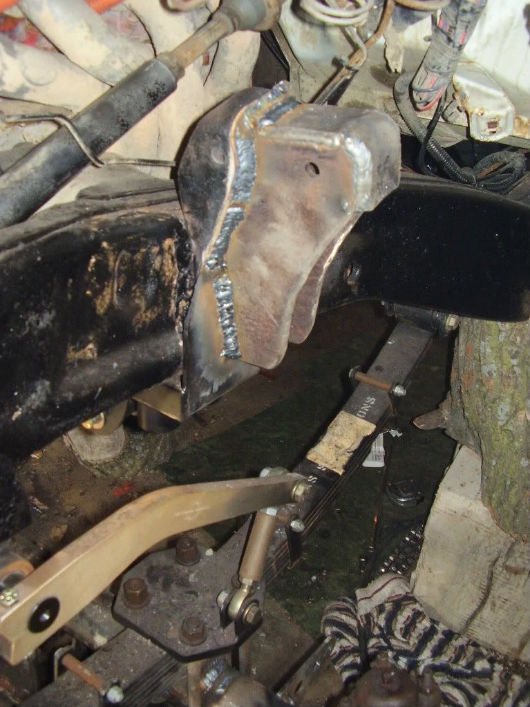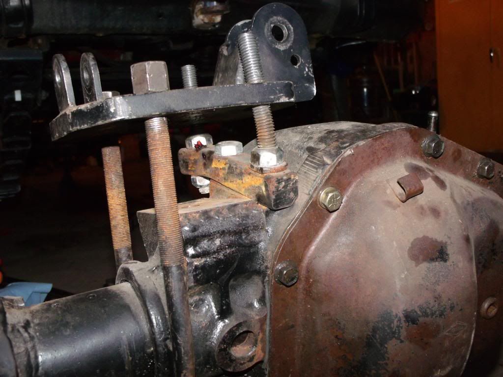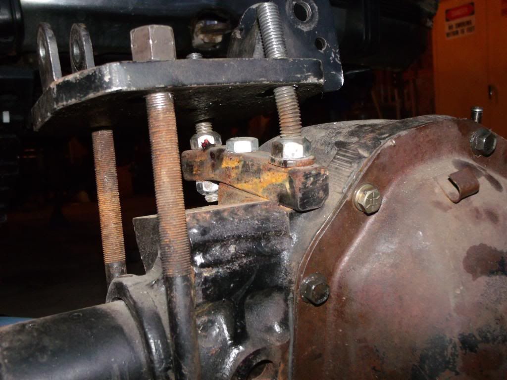 Axle had outers cut off - turned center section to limit some drive shaft angle - outers welded back on - shim welded on spring plate too fix sping angle - witch leaves the two studs at the wrong angle - this is how I got axle - if you see in pic they bolted square stock to axle at wrong angle and fixed by bending square stock in rear adding threaded rod- - front treaded rod in axle front stud hole - locked down square stock with nut - then bent threaded rod too fix wrong angle. This my have worked for them but I know it has been bugging me sence I got axle. I new I had to do something an never adressed it till now.  I'm Thinkin  will be strong when it comes back from its surgery