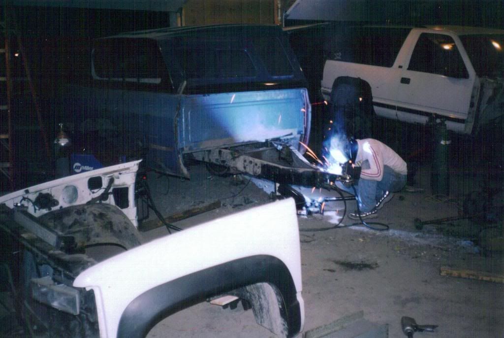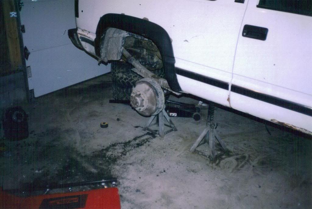 ++peace installed heavy duty rear shakle flip. Grinding pearches off to fix drive shaft angle. ready to slide back under truck and weld new pearchs on. have to fix wiring going to starter an change starter. wires all fryed going to it. Got hot by headers