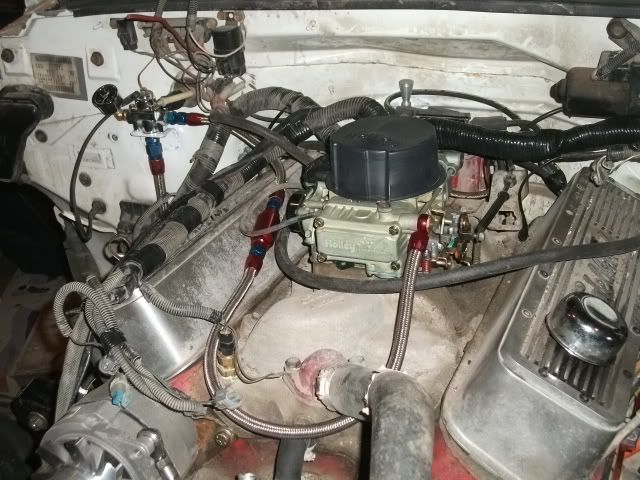 Well poured fuel  in fuel cell the other night. Only had one very small drip from a fuel filter. Got new one on the way. Fired engine up tonight. O such a sweet sound BBC. Still have to pull distr-cap to put new msd rev limiter cap on. Dam was it nice to hear it run. Love the new electric fuel pump ,new carb. fired engine with first turn of the key. Still have to set timing. replace drain plug seal on transmission pan its got slow drip.