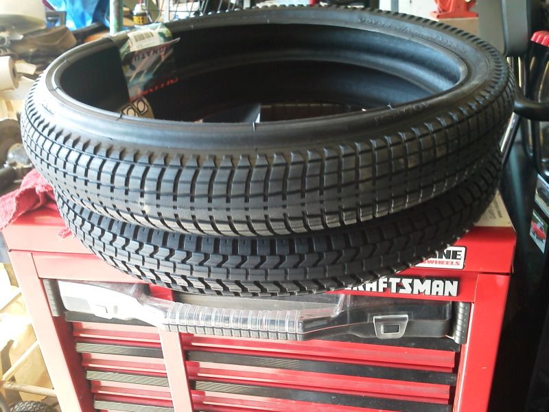 Tires are 20 inch front is 2.20 wide and the rear is 2.25.  Old school P-Lyte tires.