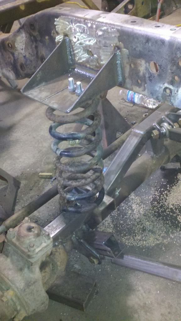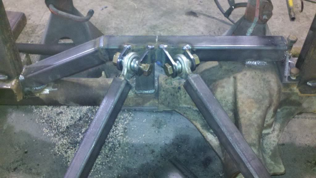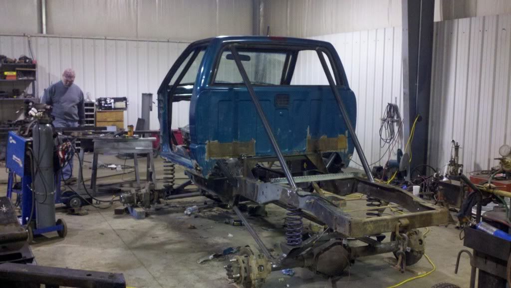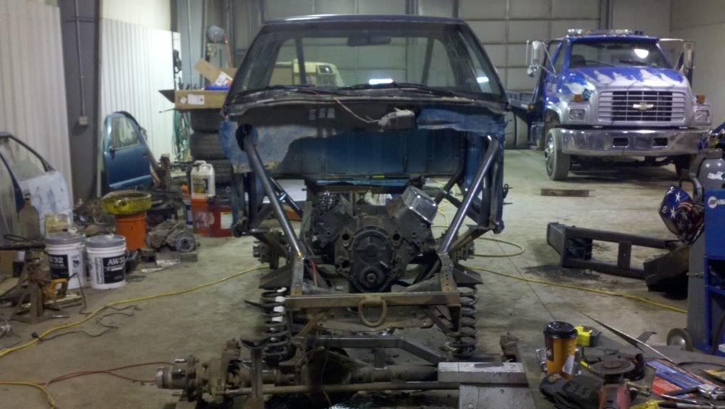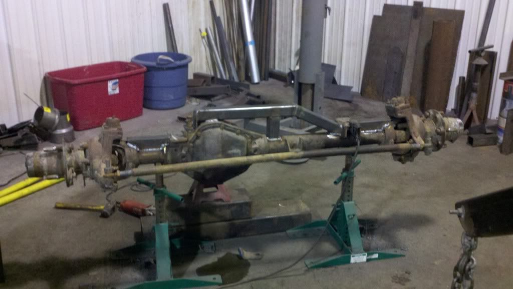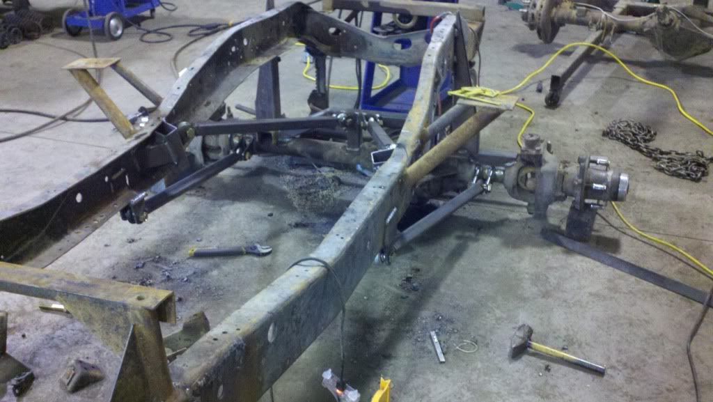 As you can see triangulated 4 link front and rear. Moved 60 forward 4 inches and moter is about 5in back to put a bbc balancer over axle center. Suspension is 2in taller in back and 4 in front then it was to make up for 40s in the front and 44s in the back. Using f150 coils front and 250 pounders in back. Got 9in of up travel front 7 rear. Got two 18.4 16.1 vees im cutting for rear and some cut turf tire 18.4s front. For some reason they are 4in shorter then rear?  Moter is tbd for now. Found steering from a gleaner combine so were gonna try that. Gutting everything and building cage. More to come soon i hope. This is being built on an extremely tight budget. There are a few things i would do differnt if i had some money but we'll see how much fun we can have for cheap!