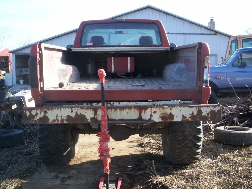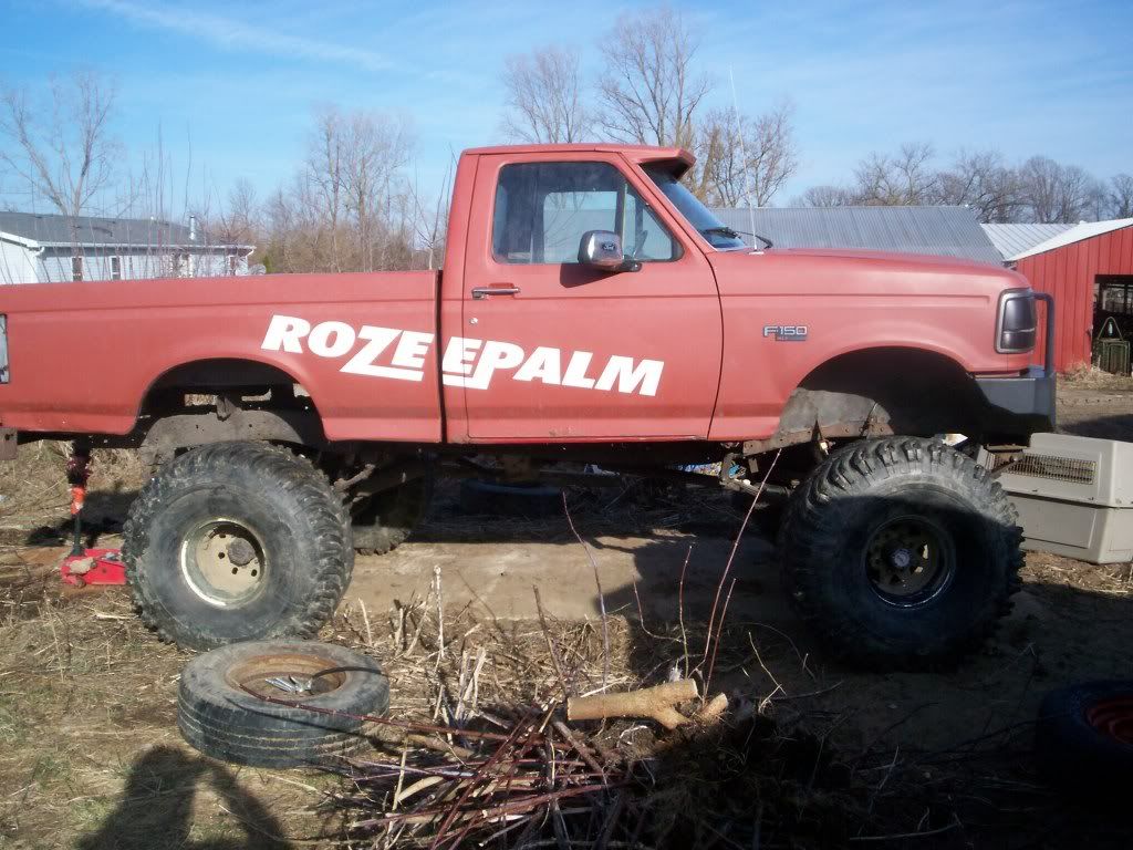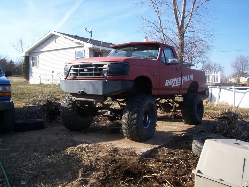 well i pick rozee palm up from a fellow wegotmudder. i just had to have it after seeing it on here so i sold my chevy mud bogger project (since im more of a ford guy then chevy) to get this one .i picked it up with no motor, trans or tires it came with 1 ton axles with 4.10 gears, devorce 205 t-case, b&m rachet shifter, fuel cell and trans cooler in the bed, rad is still in the front but has 2 electric fans on it, gots all the toggle switches put in already has about  9-10 inches of lift
