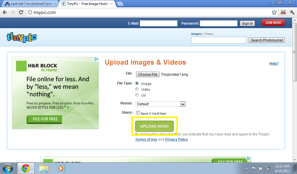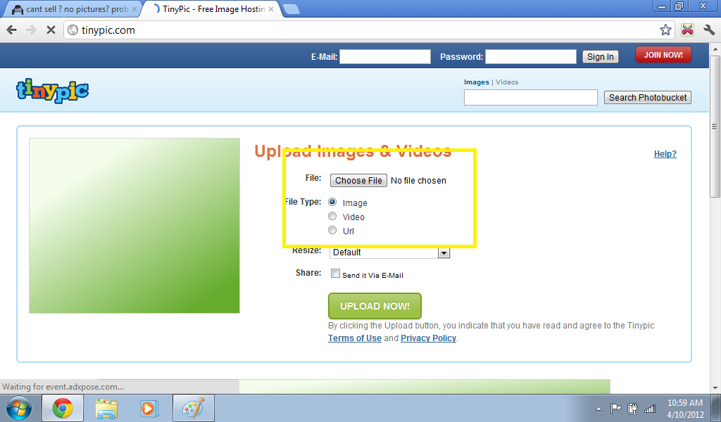 Go to www.Tinypic.com , make sure Image is selected under the "Choose File" button.