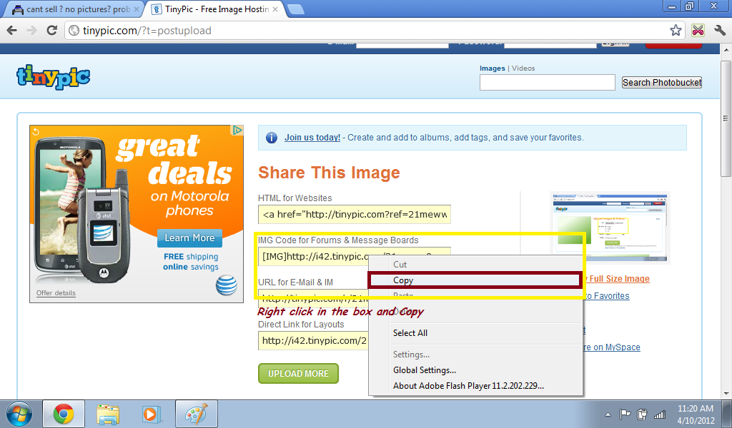 Click in the box to highlight the IMG link, then Right click to open the menu, Click on "Copy" to copy the link.