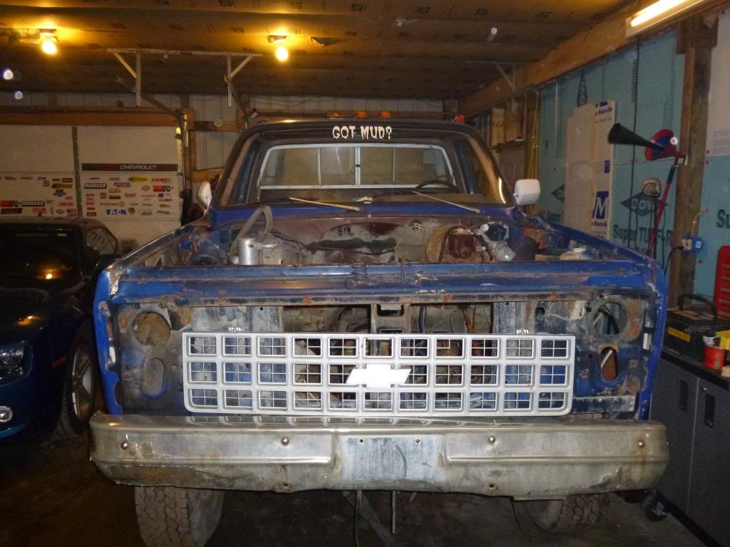 been a while since i had a chance to do anything but, we decided to pull the cab and box off and strip everything and were going to completely rebuild it from the frame up, so far we've found out that the electrical is all kinds of hacked up bad, the engine cross member is cracked the front cross brace is bent and someone hacked out the front of teh frame to put in a tow point which is now long gone... but the positive sides... i have a ff 14 bolt for it, i got a new windshield, some doors that are in good shape and some nice fenders, looking for options on frame paint, still in the air on color but probablly gonna go black with the frame, and for the body were thinking bout a dark blue with metal flake or black with some metal flake.... found out the steering column has to be replaced so were looking for a nice one, as well as a dana 60 with 4.10s, gonna pull the 350/203 and see what kinda condition the trans is in and decide from there if were gonna keep the 350 or go to a 700, but the 203 is gonna go...keeping the bench style seat, but gonna more than likely replace it with a nicer one... same with the dash pad... and after getting a good look underneath the truck all the brake and fuel lines are being replaced, but the cab is nice and solid and so is the box.... even though several of the body lift blocks are missing....took a few pics tonight and we'll try n get em up soon... it's gonna take a while to figure out some of the wireing.... the factory stuff is a mess and theres a bunch of "added" wires running through holes in the firewall.... yee haw... and the plan is to replace the old glass fuse block with a newer blade style fuse block.... so if anyone has any parts they dont need or want lemme know... got lots to trade