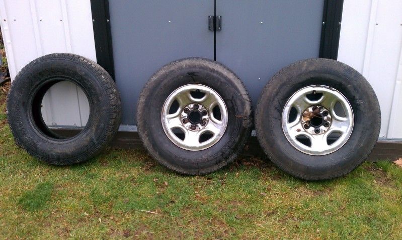 I have (2) 6-lug steel chrome wheels that came off of my 99 Silverado when I bought it. The tires are in good shape with a lot of tread life left. They are LT235/85/16 Continental Load Range E. I also have a P245/75/16 with great tread that I'll through in too (no wheel for it though). I just want these out of my way ASAP! First $50 gets it all. Located in Clarkston, MI 48346. Pm or call 248-535-6057