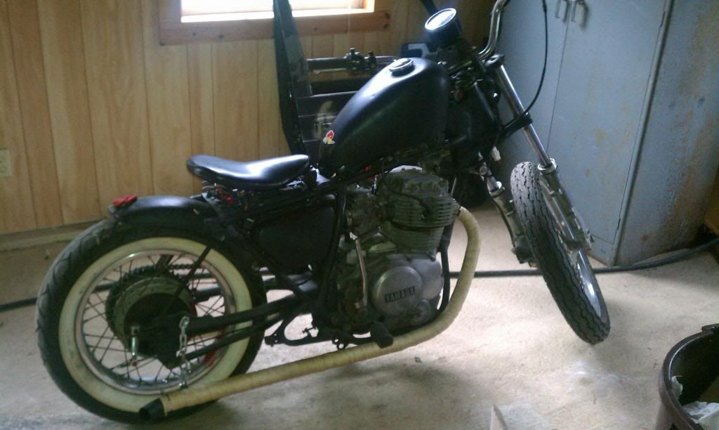 80 Yamaha 400 which has been bored and stroked old school Harley seat Harley tank Harley softail head light Honda rear fender very nice in town riding bike, needs different rear drive gear to be a highway friendly due to how high youll have to have it reved. but other than that nice in town bad ass loud bike.