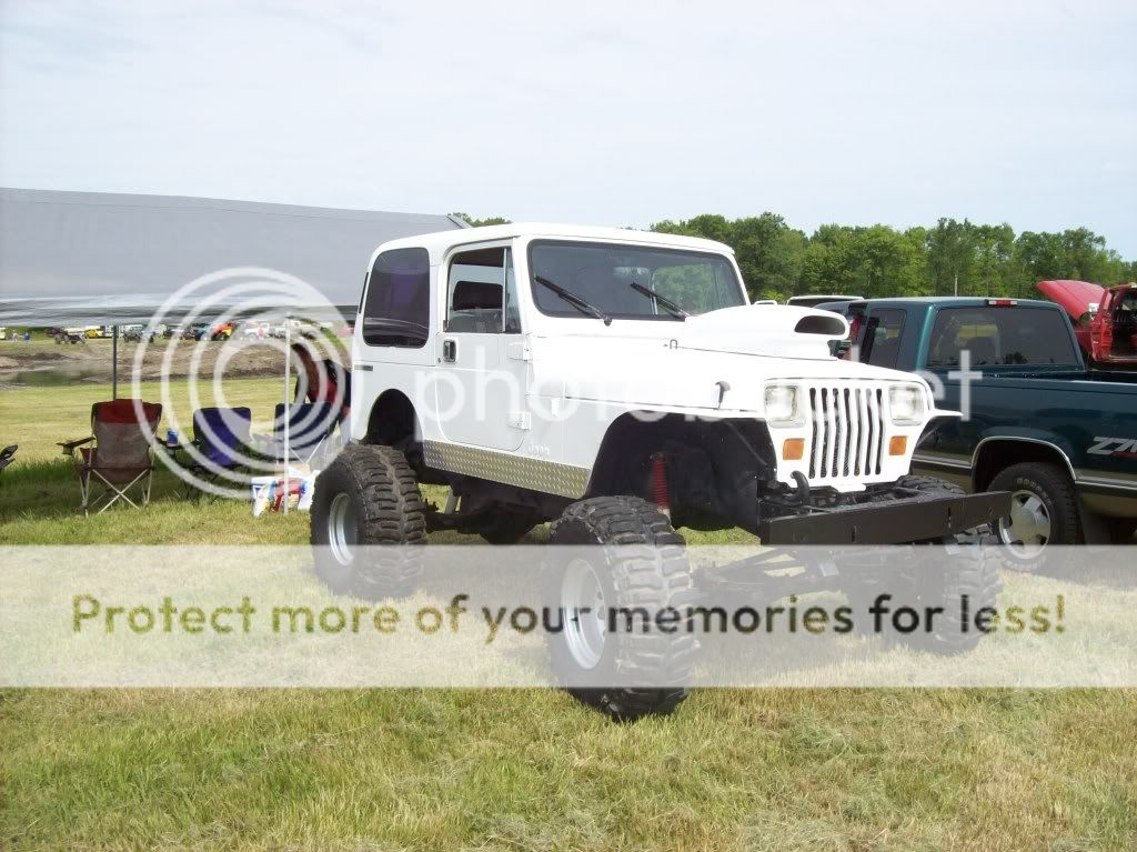 82 scrambler ,blazer frame ,small block.It runs everything from 33's-44's....83 cj7.full size chevy axles..48 inch terra tires.. 83 cj7... purple. 350 chevy toyota axles,37 inch boggers..have fun and keep the rubber side down.. Swampy